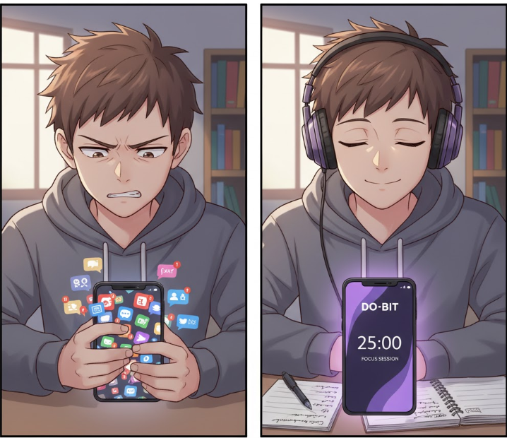 그래서 이 모든 기능을 하나로 합쳐 제가 직접 'DO-BIT(두빗)'을 개발했습니다. '실행하는 습관(Do-Habit)'이라는 의미를 담은 DO-BIT은 흩어져 있던 집중 도구들을 모아 여러분의 동기부여를 강력하게 지원합니다.